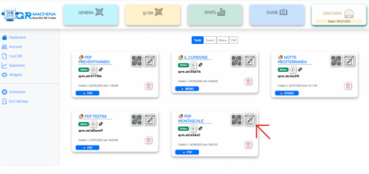 Per creare e archiviare il tuo Codice QR per File PDF non ti servirà fare altro che premere l'apposito tastino in alto a destra: