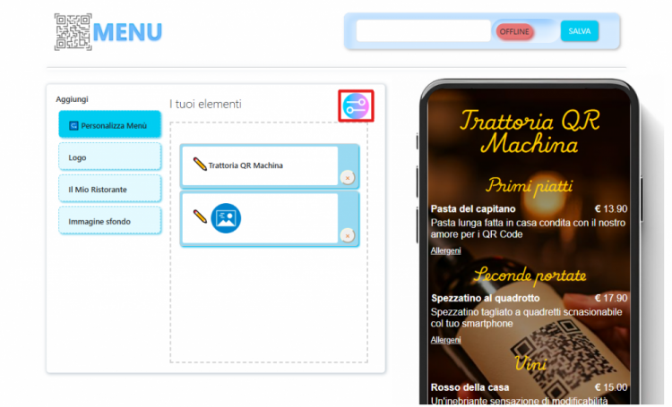 Una volta completate le personalizzazioni, non dovrai fare altro che salvare le modifiche. Con il tasto "Salva", ti assicuri di registrare nella tua area personale il codice QR salvato, con tutte le modifiche e il tuo menu personalizzato.