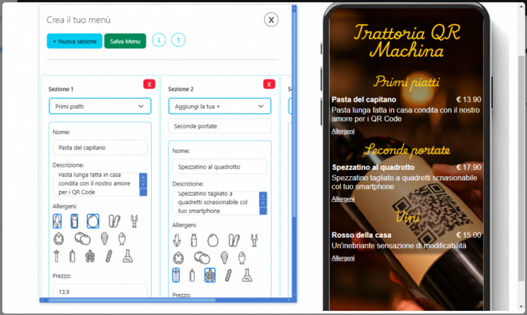Premi il tasto "Personalizza Menu" per attivare la funzione di creazione del menù digitale. Con il tasto "Nuova Sezione" si aprirà una casella dove potrai decidere il tipo di sezione del menù che vuoi creare: antipasti, primi, carne, pesce, ecc. Una volta scelta la sezione, premi il tasto "Aggiungi" per creare il piatto.